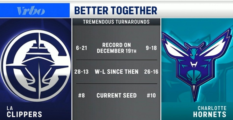 从12月19日至今战绩:快船28胜13负,黄蜂26胜16负