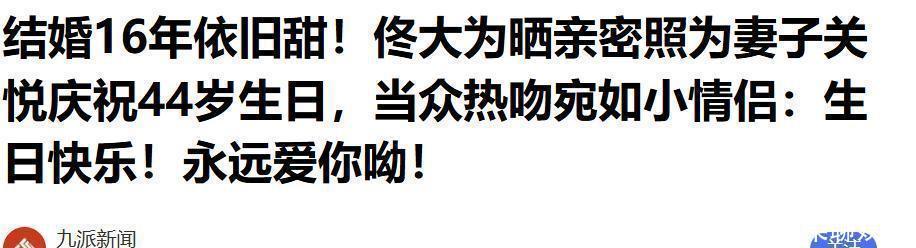 九派新闻:结婚16年还这么甜!佟大为秀恩爱,晒出亲密照为妻子关悦庆祝44岁生日,当众一个甜蜜热吻,俩人像刚谈恋爱的小情侣似的:生日快乐!永远爱你哟!